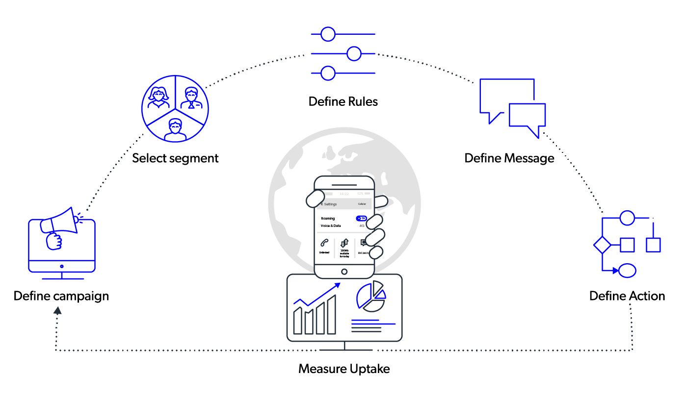 Mobileum’s Roaming Campaign Management is a centralized, real-time campaign system that lets telecom operators build and deliver personalized roaming offers to subscribers across SMS, WhatsApp, email, and in-app channels. It uses analytics and subscriber behavior to send the right message at the right moment during the customer’s travel lifecycle.
