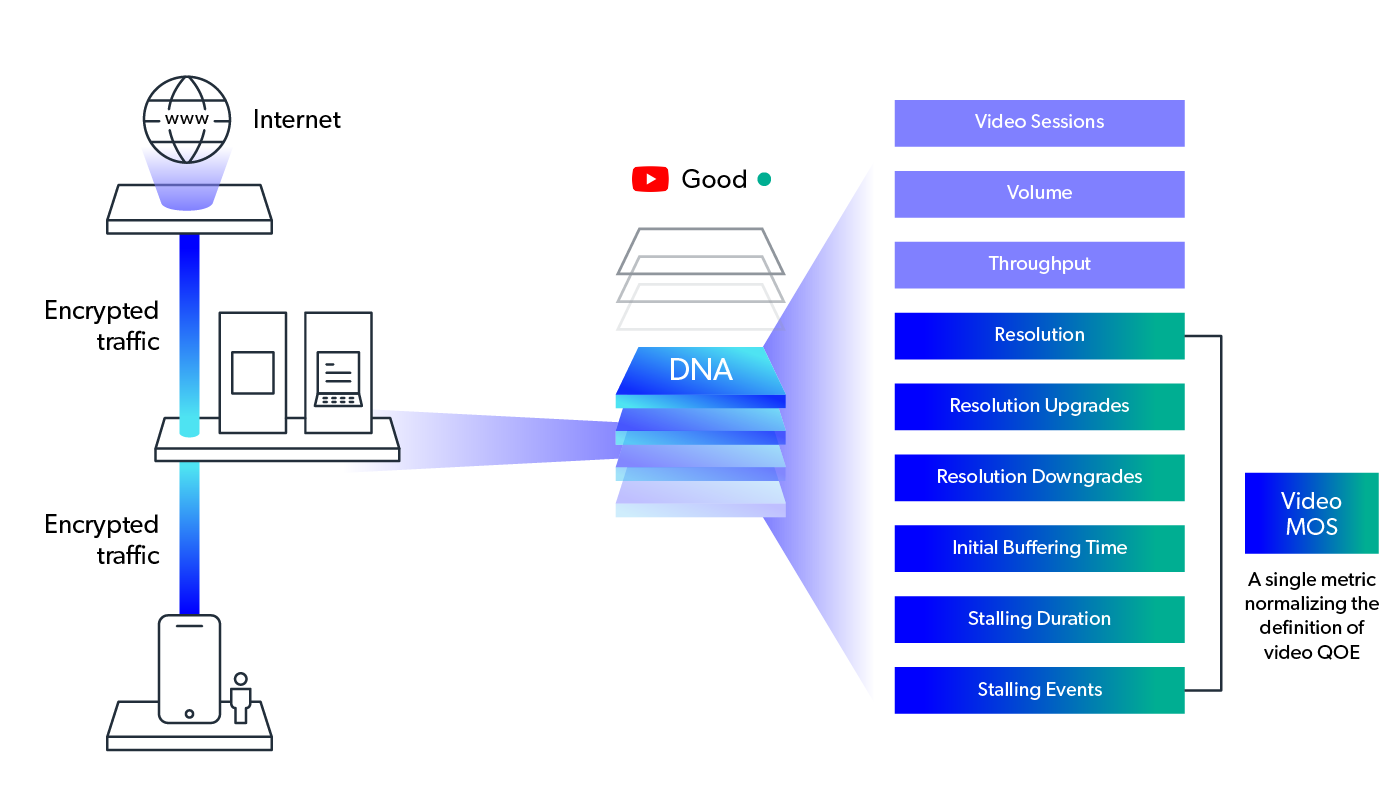 Throughput, volume, latency, resolution, vMOS, Stalling.